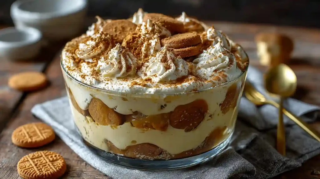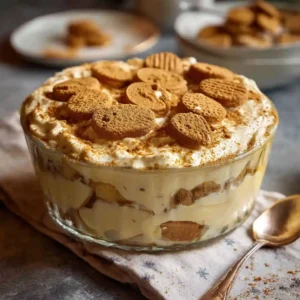 This Biscoff Banana Pudding recipe combines the nostalgic flavors of traditional banana pudding with the warm caramel notes of Biscoff cookies. The layers of creamy pudding, whipped cream, and fresh bananas create a dessert that is both light and satisfying.