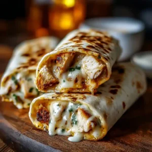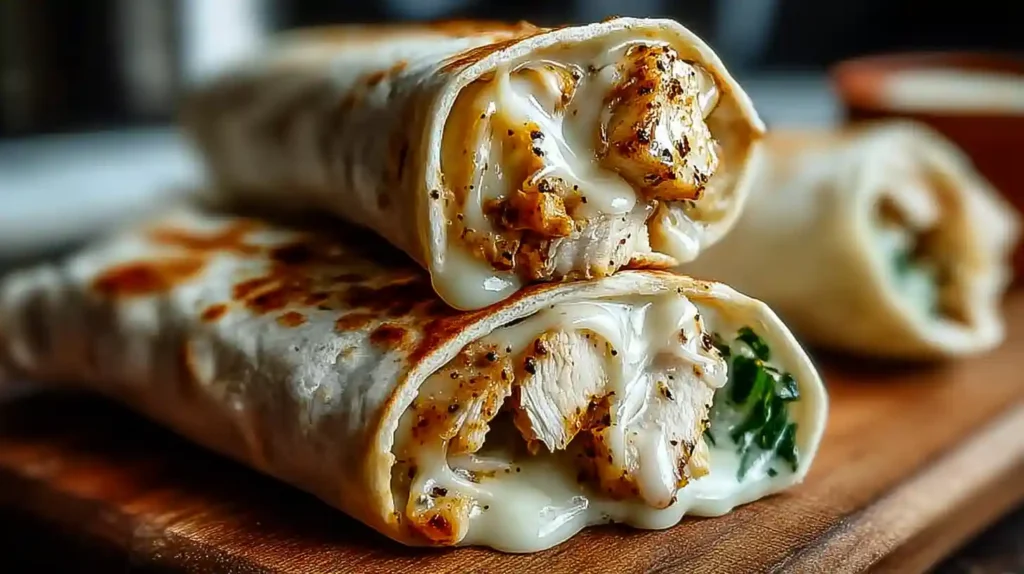 Heat a skillet over medium heat. Place wraps seam-side down and cook for 3–4 minutes per side until golden and crispy and the cheese is melted. This step gives the Cheesy Garlic Chicken Wraps Recipe its irresistible crunchy exterior. - Serve