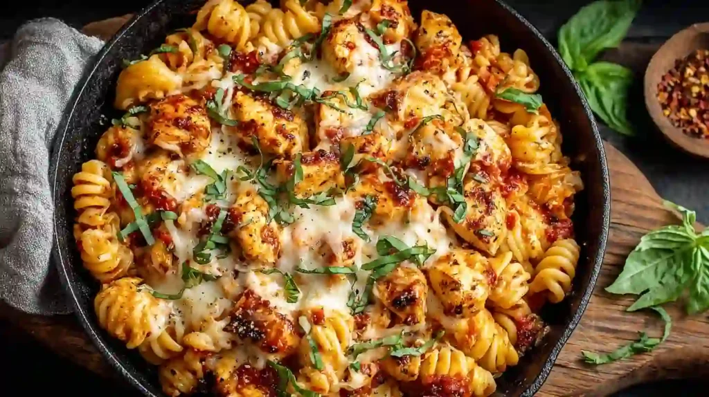 This Chicken Parmesan Pasta Skillet is a quick and comforting one-pan dinner ready in just 25 minutes. Tender chicken pieces, perfectly cooked pasta, rich tomato sauce, and melted mozzarella cheese come together for a simple yet satisfying meal. It’s a family-friendly recipe that delivers classic Italian flavors with minimal effort.