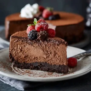Chocolate Mousse Cake is a rich, creamy, and indulgent dessert made with a crunchy Oreo crust and a smooth chocolate mousse filling. This elegant no-bake cake is perfect for celebrations, dinner parties, or whenever you crave a luxurious chocolate treat.
