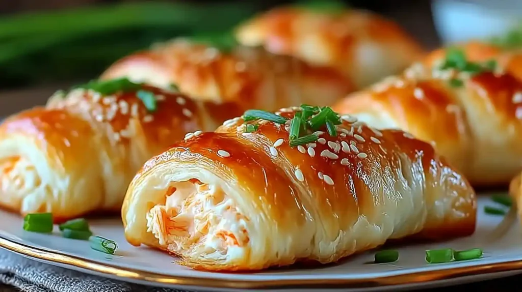 - Crispy, golden crescent rolls with a creamy seafood filling