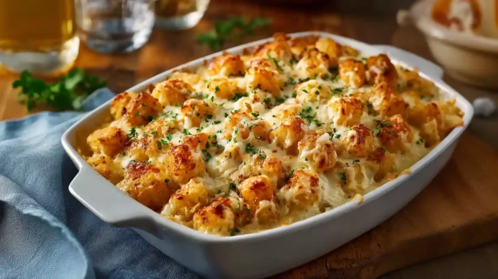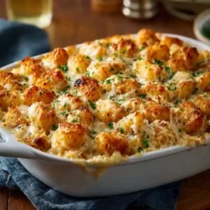 This Creamy Chicken Alfredo Tater Tot Casserole Recipe combines creamy texture with irresistible crunch in every bite.