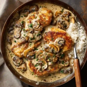 This recipe combines juicy pan-seared chicken with a velvety mushroom cream sauce that feels restaurant-quality but is easy to make at home. The mushrooms bring earthy flavor while garlic and Dijon mustard add depth to the sauce. It’s a family-friendly meal that pairs beautifully with pasta, rice, or mashed potatoes. Best of all, it cooks in about 30 minutes using just one skillet.