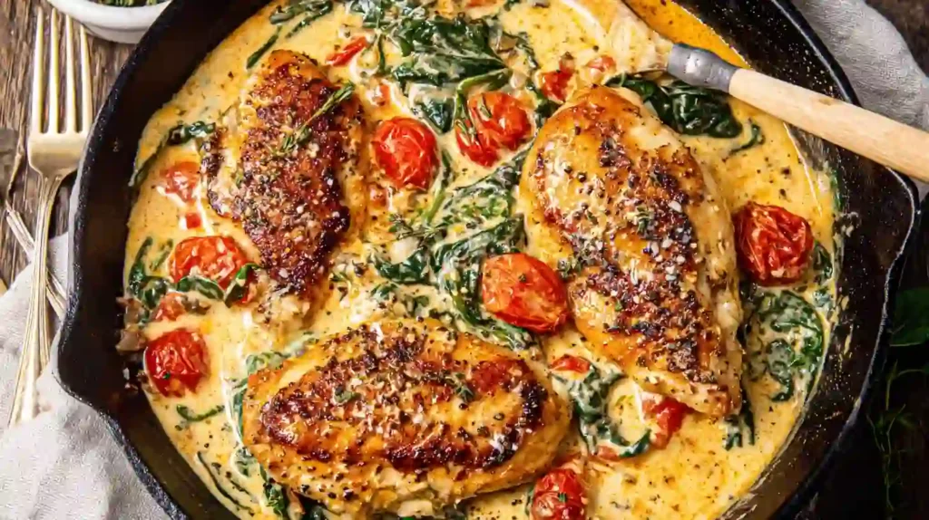 Creamy Tuscan Chicken is a rich, comforting skillet dinner made with tender chicken breasts simmered in a creamy garlic Parmesan sauce with spinach and cherry tomatoes. This Creamy Tuscan Chicken recipe feels restaurant-quality but comes together easily at home, making it perfect for weeknight dinners or special occasions.