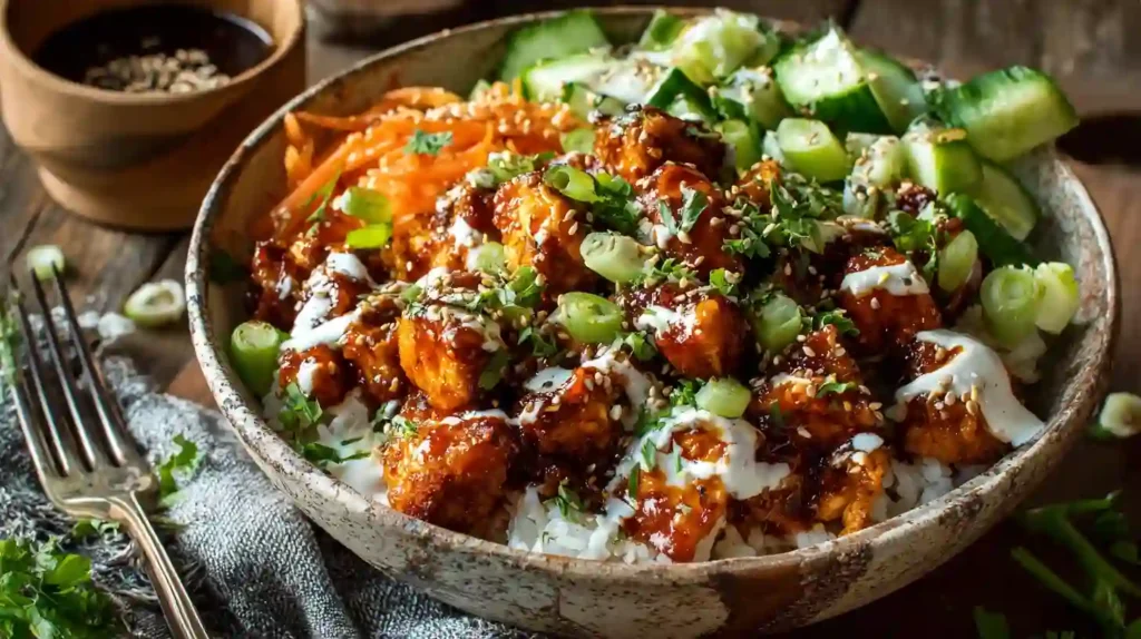 These Crispy Buffalo Chicken Bowls are bold, spicy, and packed with flavor. Featuring golden crispy chicken tossed in a sweet and tangy buffalo sauce, served over rice with fresh veggies, this bowl is a perfect balance of heat and freshness.