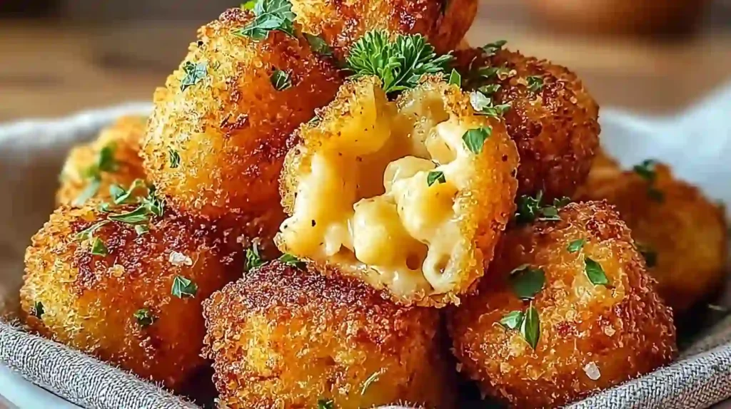 Serve these crispy fried mac and cheese bites fresh for best texture. They pair well with salads, sliders, or as a party platter centerpiece.