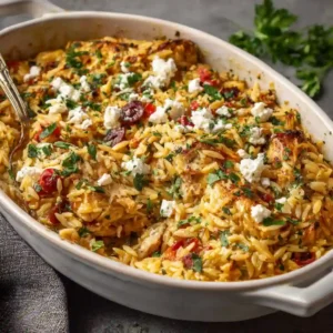 This Greek Chicken Casserole is a simple, flavorful meal that brings Mediterranean ingredients together in a comforting baked dish. With tender chicken, bright lemon, creamy feta, and perfectly cooked orzo, it’s an easy dinner that delivers bold flavor with minimal effort.