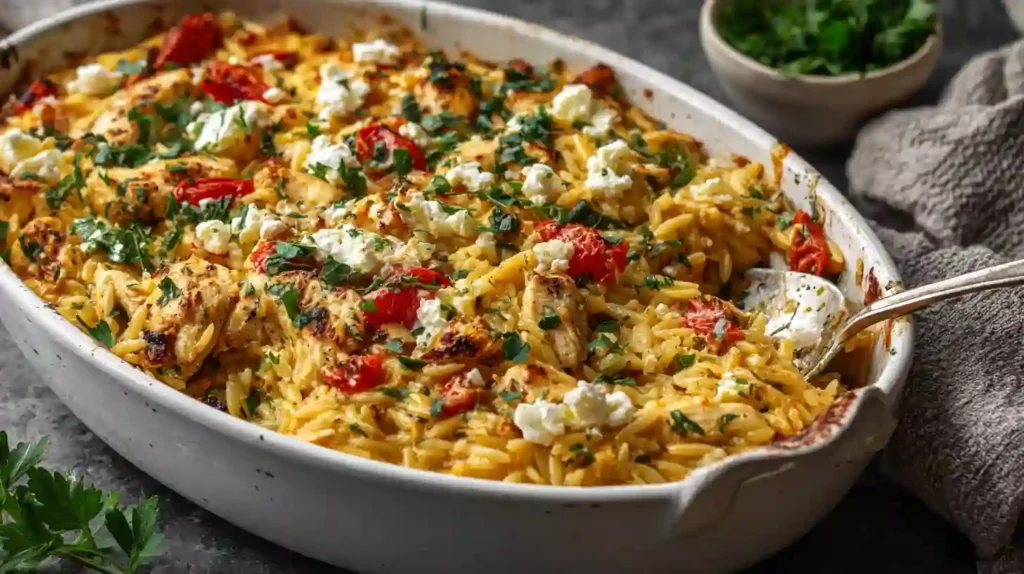 This Greek Chicken Casserole is a vibrant Mediterranean-inspired dinner packed with bright flavors and wholesome ingredients. Tender shredded chicken, orzo pasta, spinach, sun-dried tomatoes, and feta cheese bake together in a lemony broth that creates a comforting yet fresh one-dish meal. This Greek chicken casserole is easy to prepare, family-friendly, and perfect for busy weeknights.