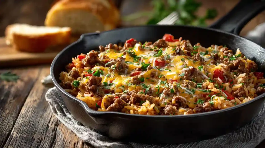 Ground Beef and Rice Skillet is a comforting, one-pan meal that’s perfect for busy weeknights. This easy Ground Beef and Rice Skillet combines tender beef, fluffy rice, and rich tomato flavors into a satisfying dish the whole family will love.