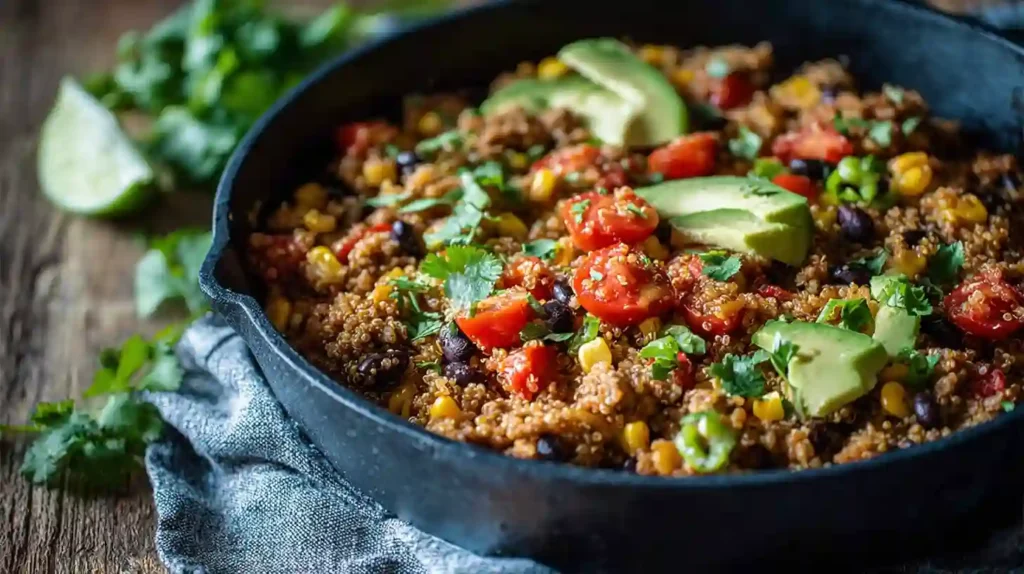 This Ground Turkey Taco Quinoa Skillet recipe is simple, nutritious, and full of flavor. Lean ground turkey provides a high-protein base while quinoa adds fiber and texture. Black beans, corn, and tomatoes bring color and freshness, while taco seasoning delivers classic Mexican-inspired flavor. Best of all, it’s a one-skillet meal that makes cleanup easy.