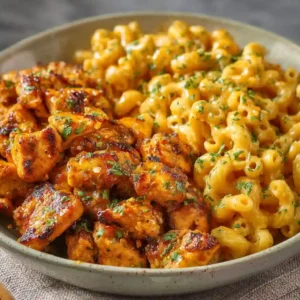 The creamy mac and cheese is made from scratch using mozzarella, cheddar, and heavy cream, creating a smooth and cheesy sauce that perfectly complements the chicken. It’s also ideal for meal prep since it reheats well and stays flavorful throughout the week.