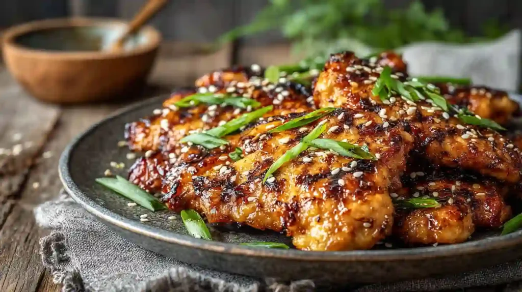 Korean Chicken is a bold, flavorful dish made with tender grilled chicken marinated in a sweet and savory soy-based sauce. This easy Korean Chicken recipe combines garlic, ginger, sesame oil, and a touch of brown sugar for a perfectly balanced glaze that caramelizes beautifully on the grill.