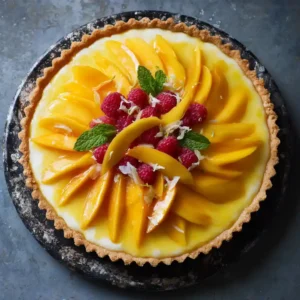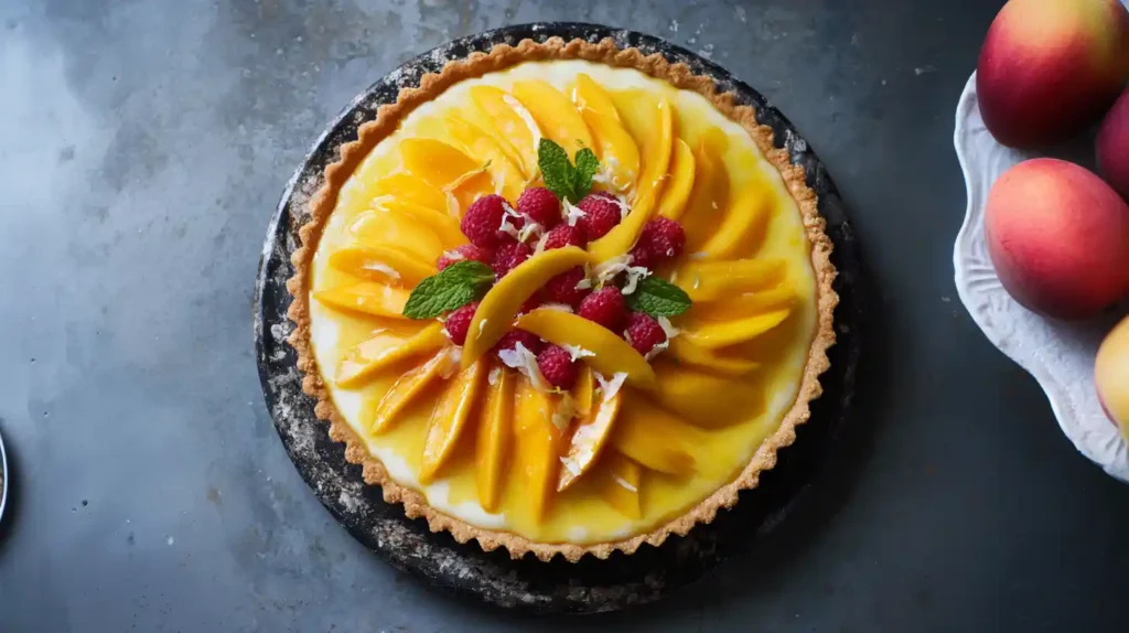 - Arrange sliced mango, raspberries, and cherries decoratively over the tart.