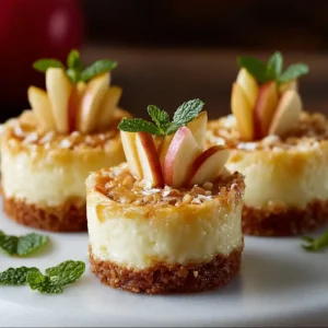 - Fill crusts with cheesecake batter, top with apple mixture, and bake 15–20 minutes until edges are set.