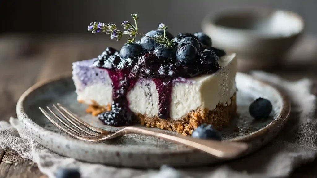 This No-Bake Blueberry Cheesecake with Lavender is a light, elegant dessert that combines creamy cheesecake filling with fragrant lavender and a fresh blueberry topping. The silky texture, floral aroma, and vibrant berry flavor make this no-bake blueberry cheesecake with lavender a beautiful dessert for spring gatherings, dinner parties, or special occasions.