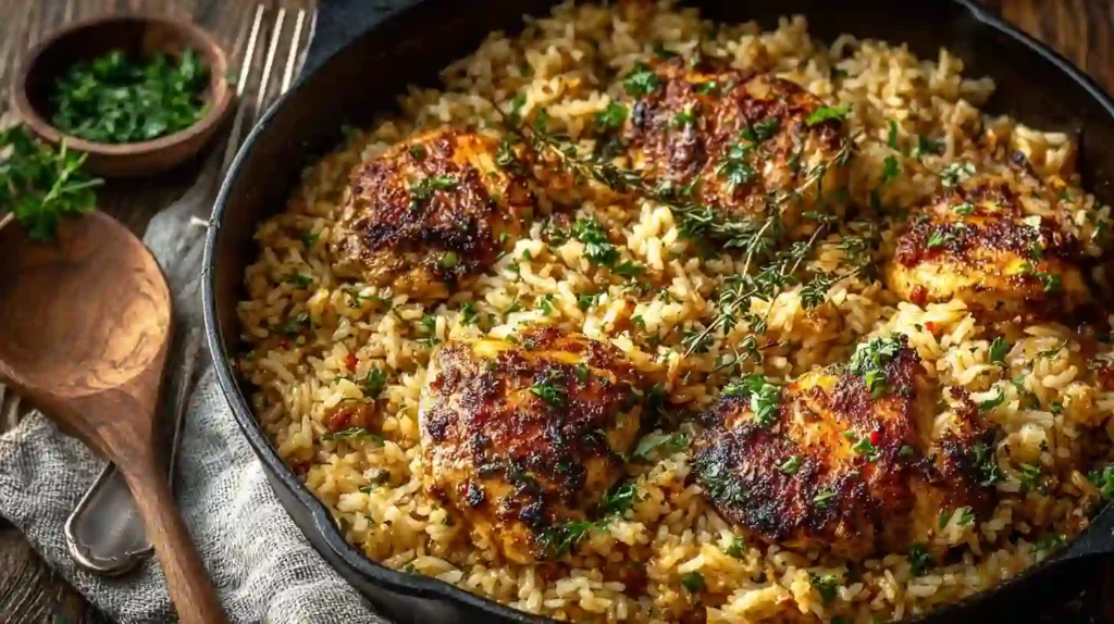 This One Pot Chicken and Rice is a simple, comforting dinner made with tender chicken thighs, fluffy rice, and warm spices—all cooked together in a single skillet. It’s the kind of reliable, budget-friendly meal that delivers big flavor with minimal cleanup.