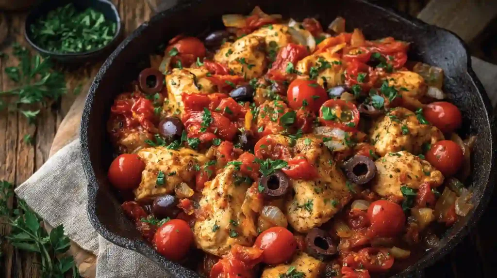 This one skillet Mediterranean chicken recipe is both convenient and full of fresh flavor. Cooking everything in a single pan means less cleanup and faster preparation. The combination of tender chicken, juicy tomatoes, briny olives, and fragrant herbs creates a balanced meal that feels both comforting and light. It’s also versatile and pairs beautifully with rice, pasta, or roasted potatoes.