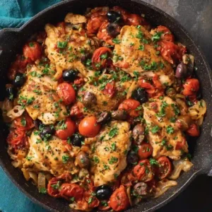 This One Skillet Mediterranean Chicken is a vibrant, flavor-packed dinner that brings together juicy chicken, tomatoes, olives, and fresh herbs in a simple, satisfying meal. Inspired by classic Mediterranean flavors, this dish is perfect for busy weeknights when you want something wholesome, quick, and delicious.