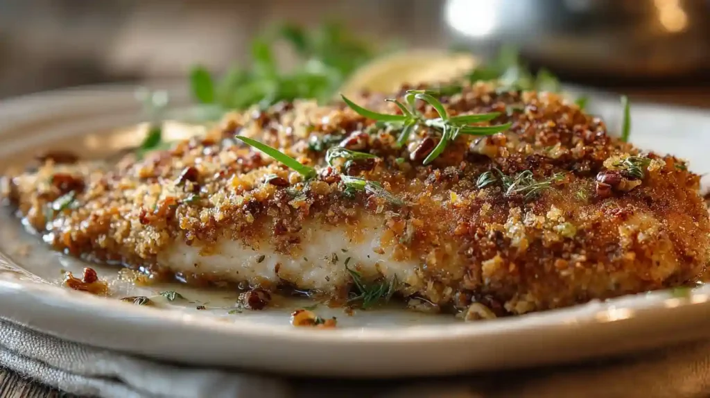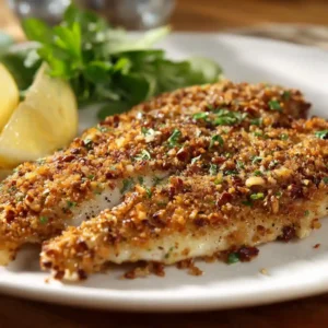 Pecan Crusted Tilapia is a delicious way to enjoy baked fish with a satisfying crunch. The nutty pecan coating, light seasoning, and bright lemon garnish create a simple yet elegant dish perfect for weeknight dinners or special meals.