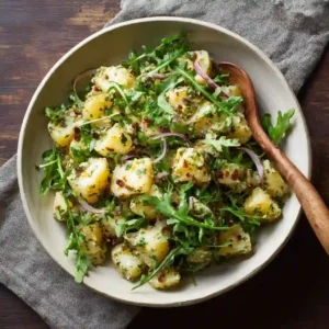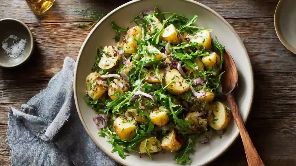 This Potato Salad With Arugula & Dijon Vinaigrette is a fresh, vibrant twist on classic potato salad. Tender new potatoes are tossed warm with peppery arugula, sharp red onion, and a bold Dijon vinaigrette that brings everything together beautifully.