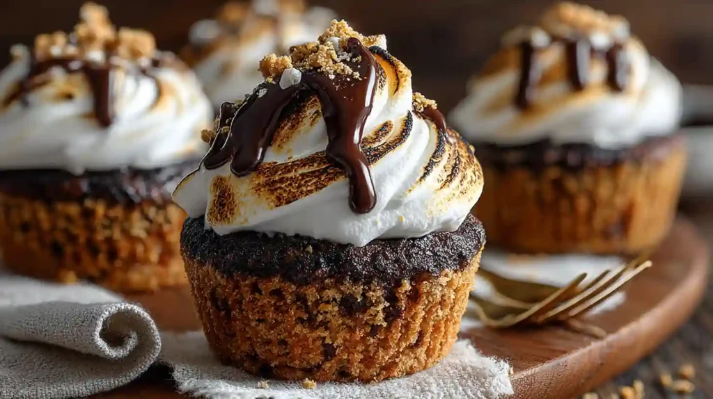 S’mores Cupcakes bring the classic campfire treat into a rich, bakery-style dessert. With a buttery graham cracker crust, moist chocolate cupcake center, and fluffy marshmallow meringue frosting, these cupcakes capture the nostalgic flavors of traditional s’mores in every bite.
