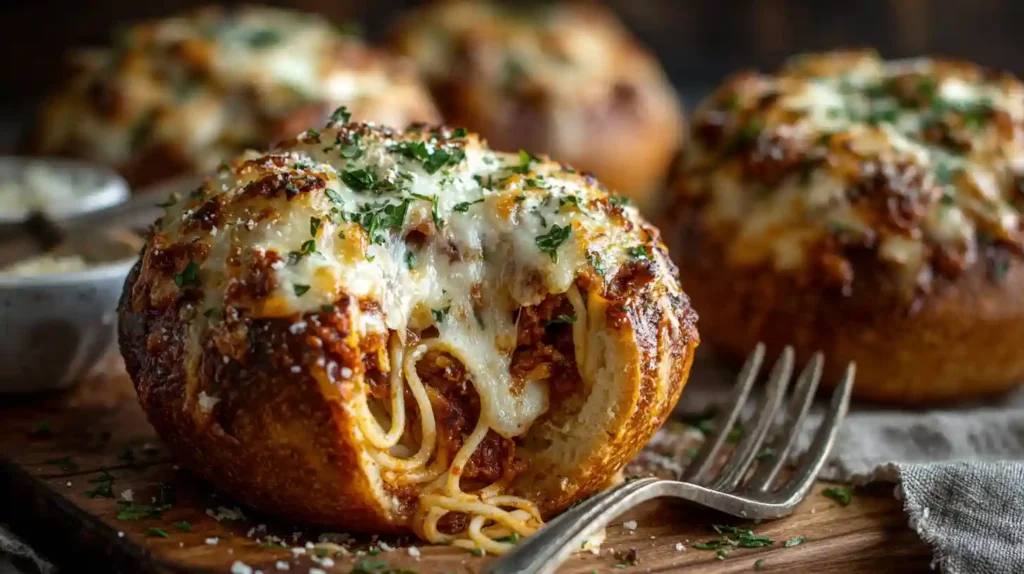 Spaghetti Garlic Bread Bowls combine two comfort food favorites into one irresistible dish. Crispy garlic butter bread rolls are hollowed out and filled with rich spaghetti and savory meat sauce, then topped with melted mozzarella. These Spaghetti Garlic Bread Bowls are hearty, flavorful, and perfect for family dinners, parties, or casual gatherings.