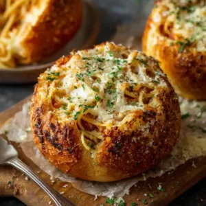 This recipe delivers everything you love about spaghetti and garlic bread in one creative presentation. The crusty bread bowl becomes buttery, golden, and crisp while soaking up the rich tomato sauce inside.
