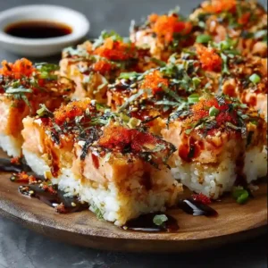 - Let cool briefly, then garnish with green onions, nori strips, and tobiko if using. Serve warm and enjoy this spicy salmon sushi bake recipe.