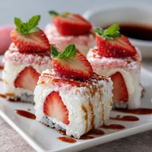 Strawberry Shortcake Sushi is a playful twist on a beloved classic dessert. With soft sponge cake, fresh strawberries, and fluffy whipped cream rolled into beautiful bite-sized pieces, it’s perfect for parties, brunch, or anytime you want a dessert that looks as good as it tastes.