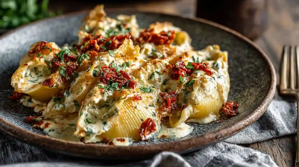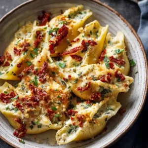 These Creamy Sun-Dried Tomato and Ricotta Stuffed Shells are a comforting baked pasta dish loaded with creamy ricotta, savory spinach, and rich sun-dried tomato sauce. With simple ingredients and bold flavors, this recipe is perfect for cozy family dinners or special occasions.