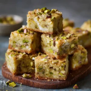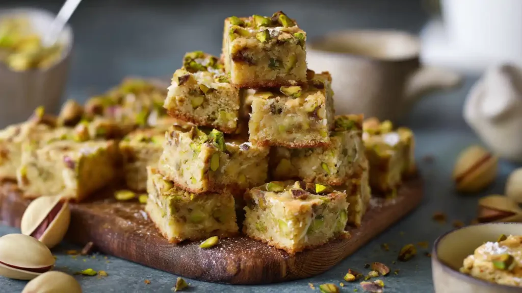 White Chocolate & Pistachio Blondies are rich, buttery dessert bars loaded with creamy white chocolate chips and crunchy pistachios. These White Chocolate & Pistachio Blondies have a soft, chewy center with slightly crisp edges, making them perfect for bake sales, celebrations, or an indulgent weekend treat.